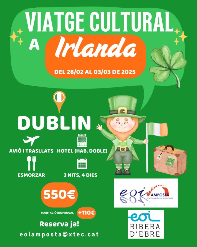 Benvolguts/des viatgers/eres, Tenim una gran notícia per compartir: el nostre viatge a Dublín va vent en popa i, a més, hem superat totes les expectatives amb 35 participants entre l’EOI d’Amposta i l’EOI de la Ribera d’Ebre! Estem ultimant els últims detalls perquè aquesta sigui una experiència única i inoblidable. Properament us enviarem tota la informació sobre: […]