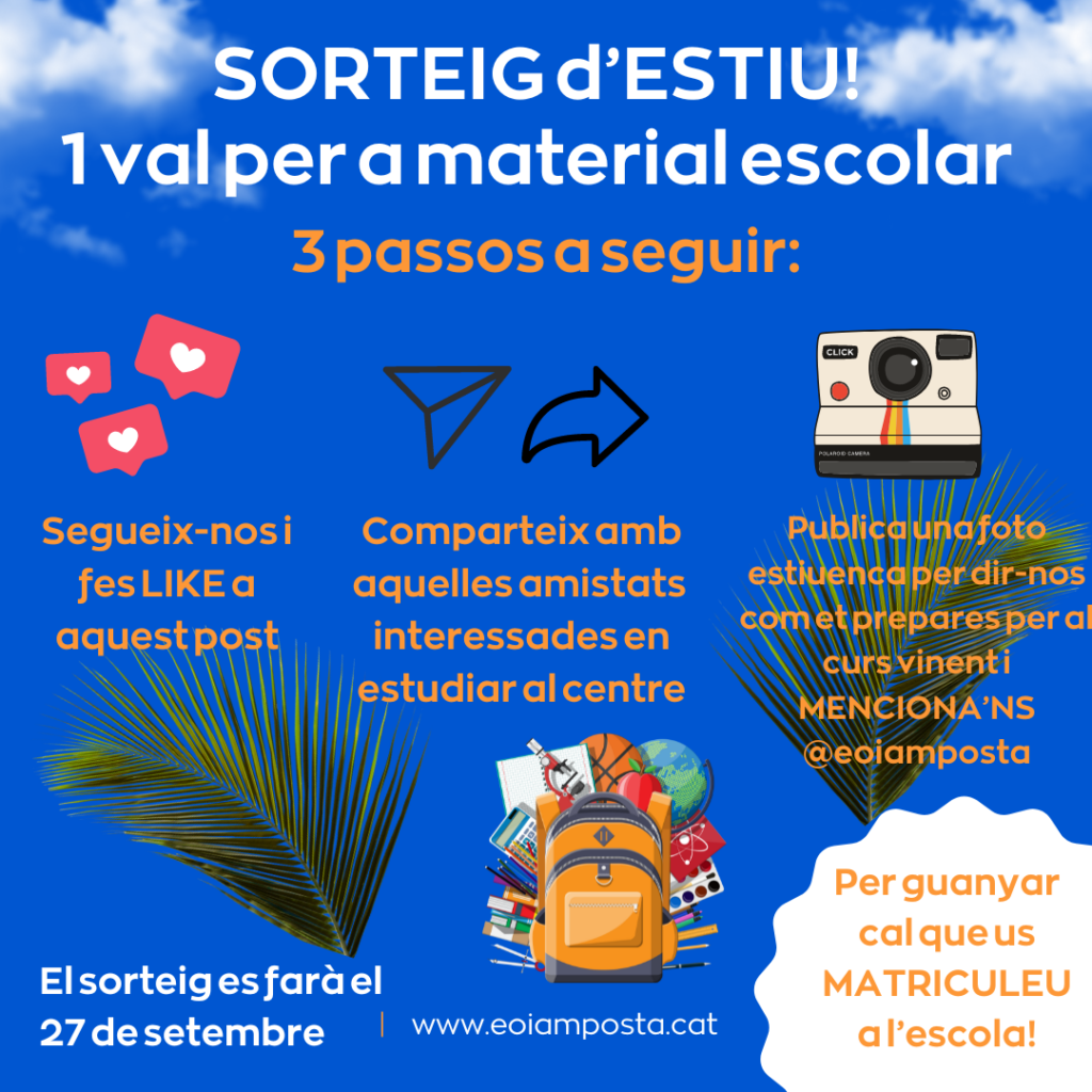 Vol guanyar un val per a llibres i material escolar? Només has d’entrar al nostre Instagram i seguir els 3 passos! Podeu participar tant alumnes actuals ja matriculats al juliol, com nous alumnes al setembre! Us recordem que NO ÉS UN CONCURS!!