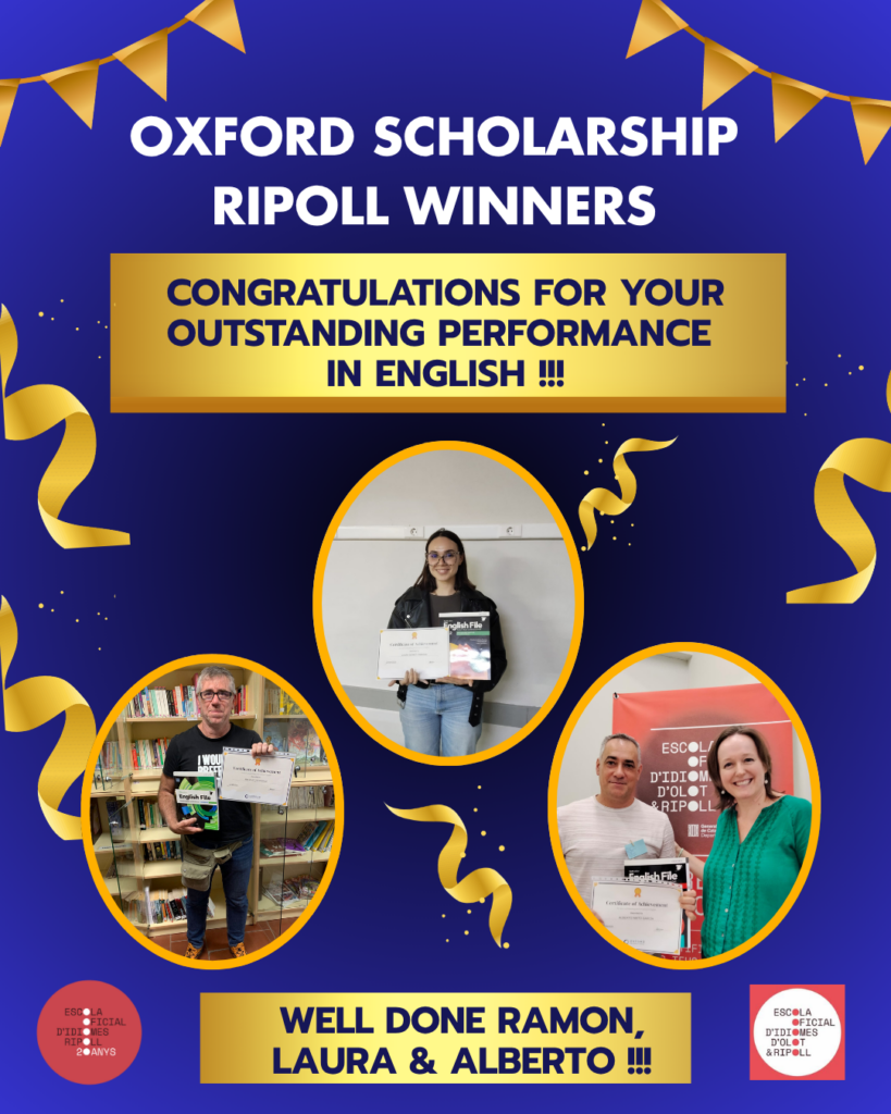 Winners of the award for outstanding performance in English !!! En Ramon V., la Laura G. i l’Alberto N. són els/les flamants guanyadors/es de la Beca d’Oxford a l’EOI de Ripoll !!! Aquest és un premi a l’excel·lència i al millor rendiment. Durant el primer dia de classe, els/les alumnes més destacats/des del curs 2024-2025 van ser premiats/des amb l’obsequi d’un llibre de text cadascun/a. Enhorabona !!!