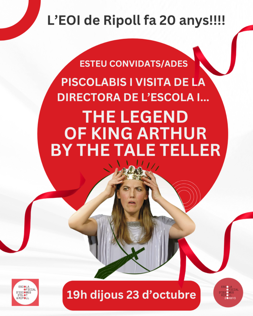 L’EOI de Ripoll fa 20 anys!!! Per a celebrar-ho rebrem la visita de la Cristina Segués, la Directora de l’EOI i farem un piscolabis amb motiu d’aquesta efemèride. A les 18.00h tindrà lloc la reunió de delegats/ades i sotsdelegats/ades. Seguidament, a les 19.00h, gaudirem de l’obra de teatre en anglès “The Legend of King Arthur” per part de la companyia The Tale Teller: “Us heu preguntat mai com es van conèixer els pares d’Artús? Com va aconseguir ser rei un noi de 16 anys? I què va passar exactament quan Lancelot va conèixer Ginebra?” Vine a descobrir-ho la tarda del 23 d’octubre !!!!