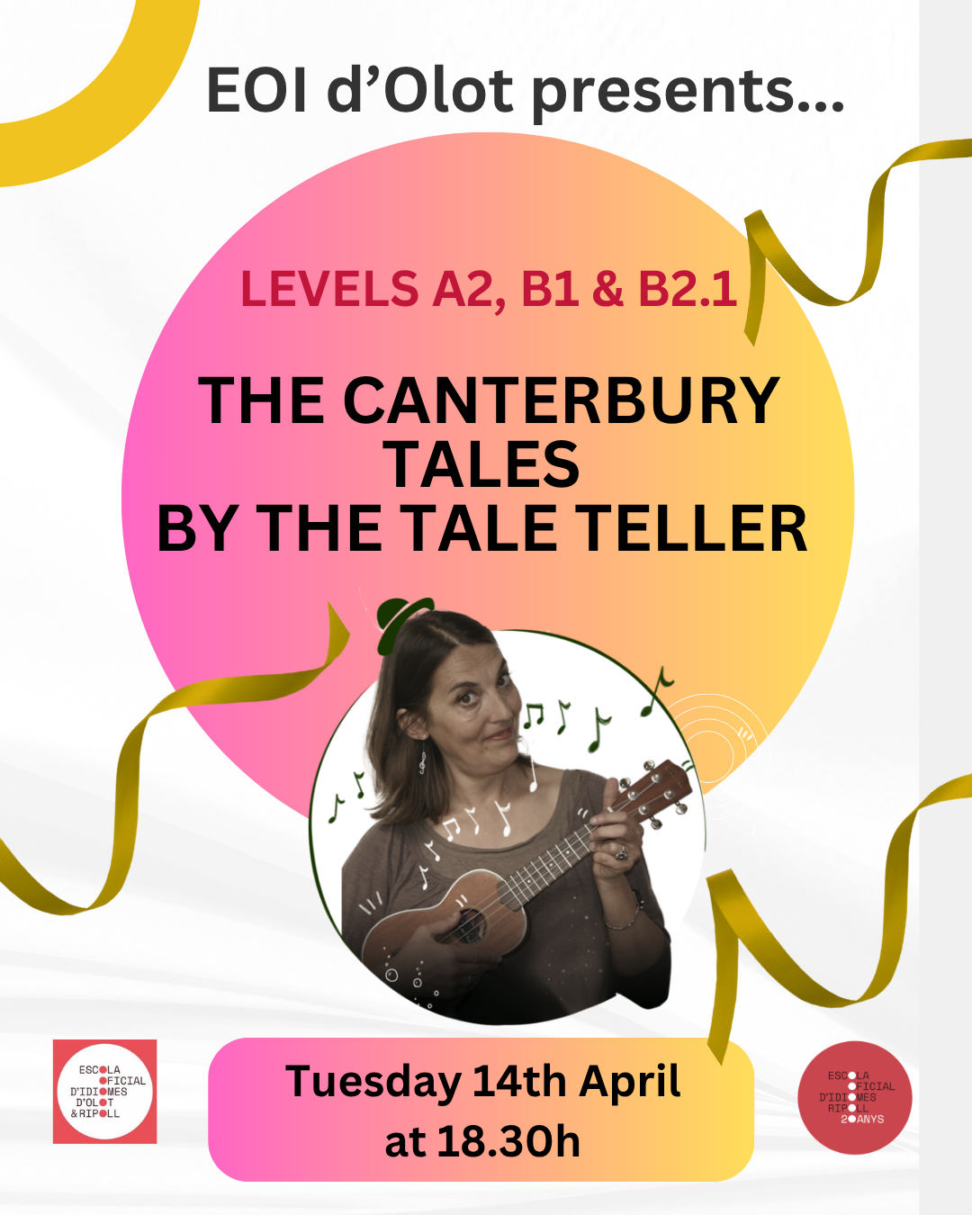 Després de l’èxit a Ripoll de l’obra de teatre en anglès “The Legend of King Arthur“, l’EOI d’Olot acollirà la representació de “The Canterbury Tales” per part de la companyia The Tale Teller. Escrits fa més de 600 anys, els Contes de Canterbury de Geoffrey Chaucer encara continuen entretenint-nos avui en dia. Vine a gaudir-ne la tarda del 14 d’abril: aprèn anglès tot divertint-te !!!!