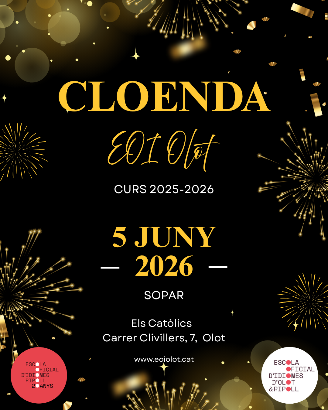 CLOENDA EOI OLOT Feu un comentari / Per admin / 15/04/2026 / Activitats Culturals Olot Portada La cloenda de l’EOI d’Olot se celebrarà el divendres 5 de juny al restaurant Els Catòlics. Properament es facilitarà més informació sobre l’organització i els detalls.