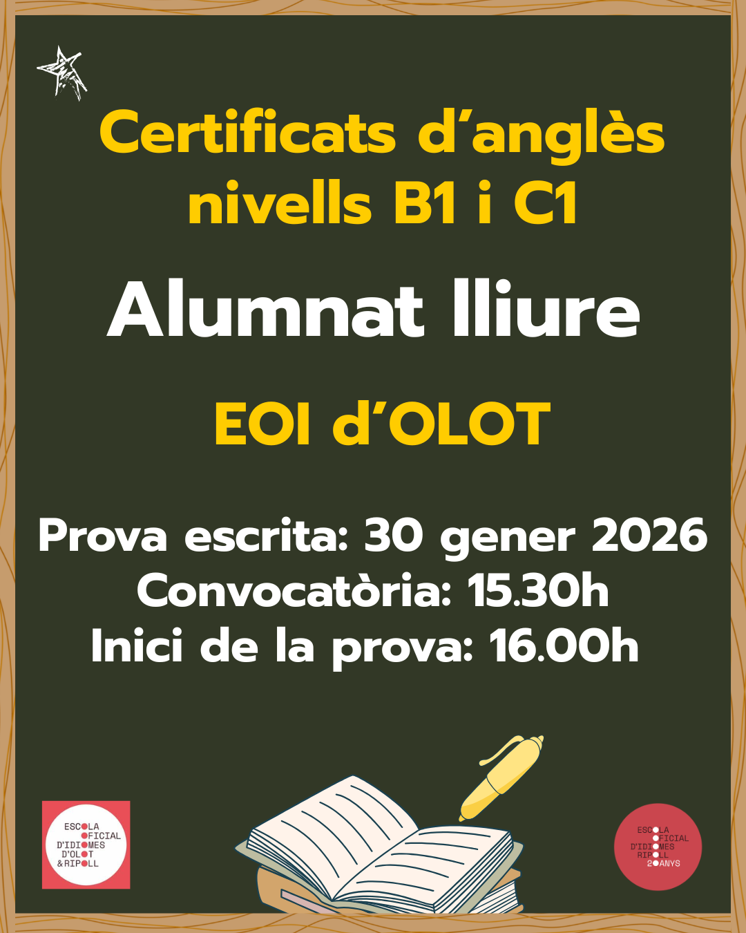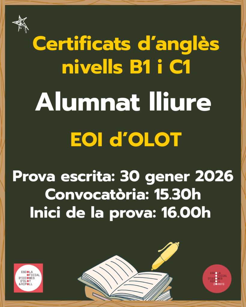 El proper divendres 30 de gener es realitzaran les proves dels certificats intermedi B1 i avançat C1 d’anglès per a candidats/ates lliures a l’EOI d’Olot. Aquestes proves corresponen a la convocatòria extraordinària organitzada pel Departament d’Educació i Formació Professional. Es tracta d’una oportunitat única de certificar els coneixements d’anglès !!