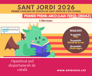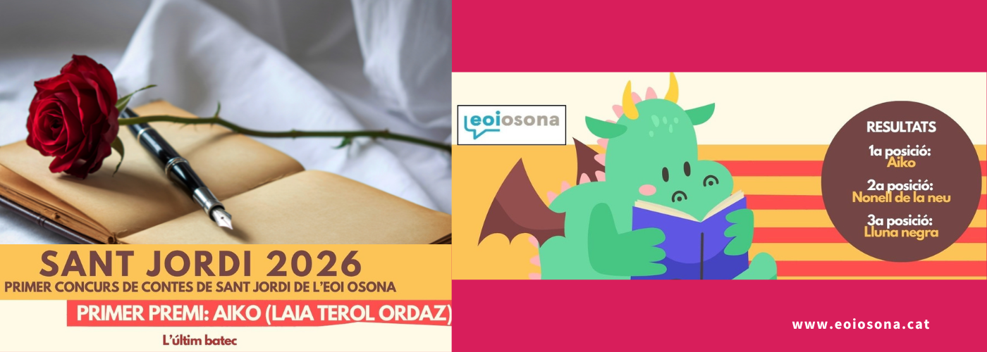 Amb motiu de Sant Jordi, els alumnes de C2 de català van escriure 19 contes breus a partir d’uns començaments donats. Les votacions per triar el conte guanyador es van obrir a tot l’alumnat de l’escola i ja tenim els resultats del Primer Concurs de Contes de Sant Jordi de l’EOI d’Osona!