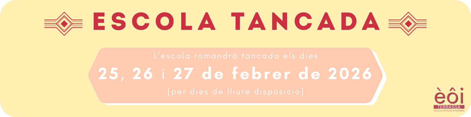 Ens plau informar-vos que l’EOI de Terrassa posa a disposició de tot l’alumnat un nou servei d’armariets, amb l’objectiu de facilitar la vostra estada al centre i oferir-vos un espai on guardar les vostres pertinences amb comoditat. Ubicació: Els armariets estan situats a la planta baixa, just al costat de consergeria. Funcionament del servei: L’ús […]