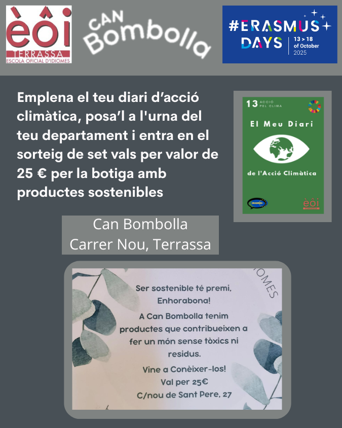 A classe us hauran repartit uns diaris d’acció climà tica. Empleneu el vostre diari d’acció climà tica amb les dues accions que heu dut a terme cada setmana per la sostenibilitat, poseu-lo a l’urna del vostre departament i entreu en el sorteig de set vals per valor de 25 € per la botiga amb productes sostenibles Can Bombolla, Carrer Nou, Terrassa.