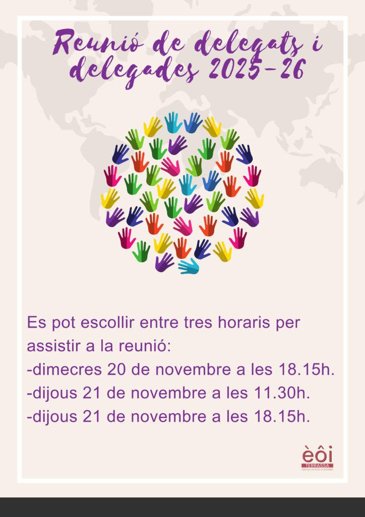 Ara que totes les classes han triat quins seran els seus representants, l’EOI Terrassa farà una reunió per donar-los la benvinguda, fer una breu explicació de l’escola, respondre qualsevol consulta i recollir els seus suggeriments.