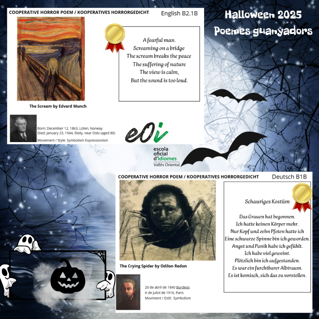 Halloween: Hem fet un concurs per classes, que ha consistit en fer un poema entre tots a partir d’una pintura d’un pintor famós. Aquí teniu els guanyadors ! |